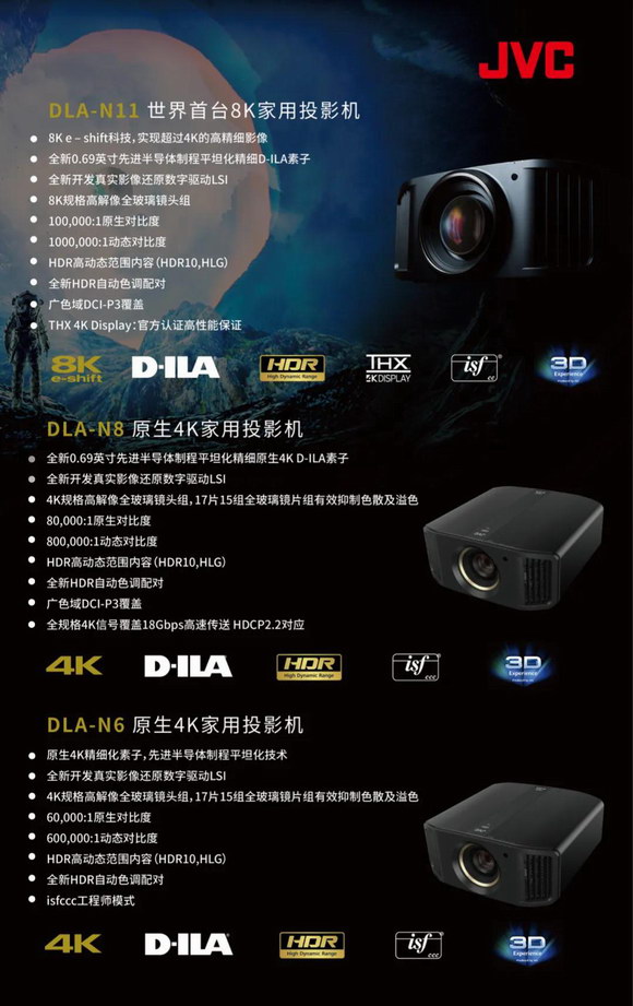 JVC 獅子座(LEO系列,N11、N8、N6)擁有8K/4K分辨率、優(yōu)異的亮度、業(yè)界最高的原生對比度、超廣的色域和精準的色彩,完美匹配4K藍光技術的核心優(yōu)勢(4K分辨率、HDR、超廣色域)。