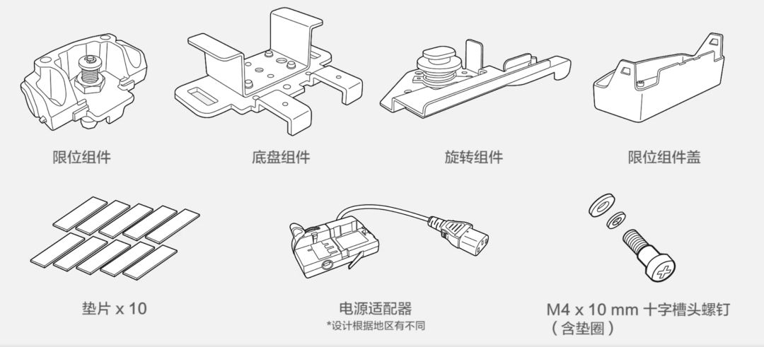 愛普生裝箱材料(限位組件、底盤組件、旋轉(zhuǎn)組件、限位組件蓋、墊片*10、電源適配器、M4*10毫米十字凹頭螺釘),愛普生LightScene激光投影燈,螺絲電鉆一把,十字頭螺絲刀以及各種型號螺絲若干。