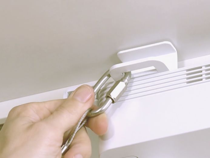 安裝電線鉤座,電線工作必須安裝在牢固的天花板支撐結(jié)構(gòu)上,例如天花板托梁和類似的地方,插入鉤環(huán)并擰緊,將鉤環(huán)連接到電線鉤座。