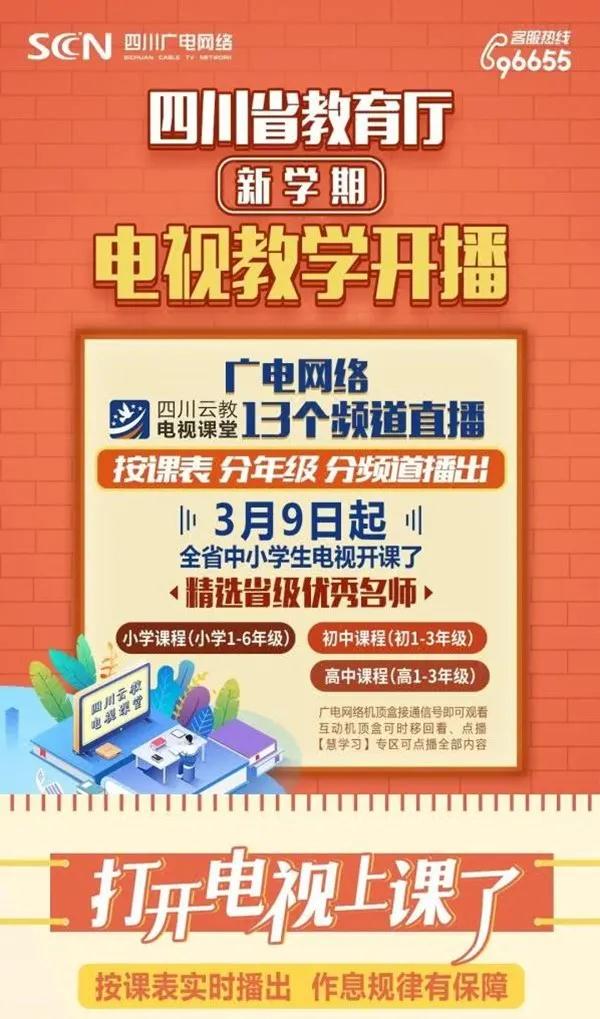 最重要的是,這些線上課程全部免費,家長們可以放心。3月9日起將依托四川省教育資源公共服務平臺(網址www.scedu.com.cn),通過四川廣電網絡有線電視分年級分頻道播出,通過四川電信、四川移動、四川廣電、四川聯通網絡電視(IPTV)教育專區和四川省教育資源公共服務平臺“停課不停教、停課不停學”專區同步推出點播、回放。