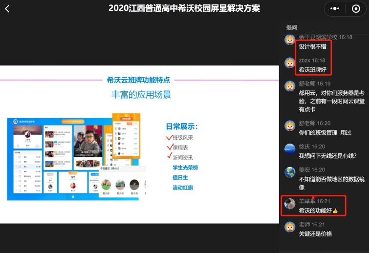 為了充分利用教育信息化手段,保證江西省新高考改革順利平穩進行,切實解決新高考啟動后高中學校普遍面臨的走班排課復雜、精準化教學不深入、教學師資不足、校園管理水平不高等突出問題,疫情期間,主題為《2020江西普通高中希沃校園屏顯解決方案》的三期培訓在江西開展。利用希沃白板的云課堂功能,各學校領導和信息技術負責人線上參與了本次培訓。