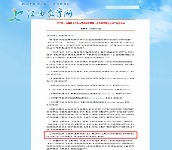 2020年2月25日,江西省教育廳發(fā)布了《關(guān)于進一步做好全省中小學教師開展線上教育教學輔導培訓工作的通知》。通知中特別指出:“加強教師培訓指導:各級教育部門要指導本地師訓、教研、信息化等部門,認真組織中小學教師參加培訓,加大對教師信息化能力的培訓力度,落實相關(guān)配套措施,為教師科學高效開展線上教學提供支撐和保障。”