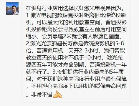 面對使用時長挑戰,長虹依然提供五年質量保障,自研自產光機壽命超過25000小時,以捍衛國產品牌驕傲的姿態為悅健時代提供硬件保障,也讓健身房的會員朋友們體驗到大屏的魅力。