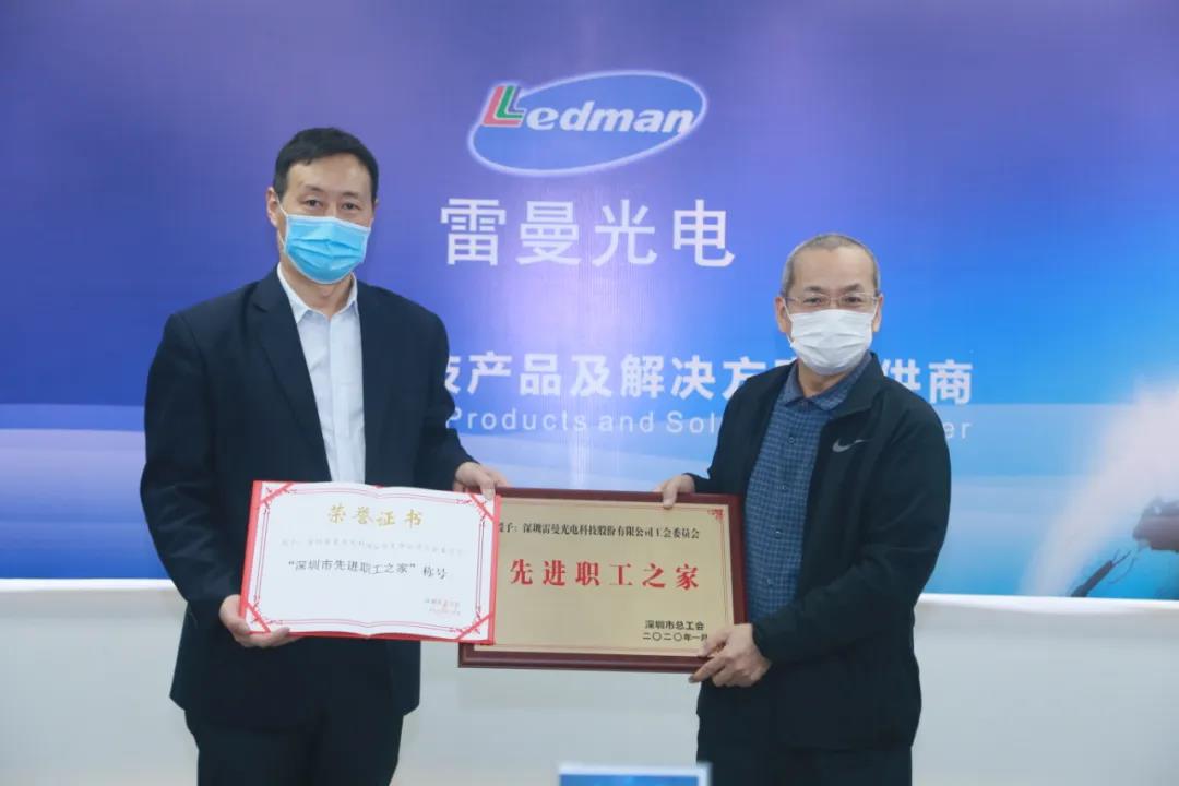 2020年4月14日上午,深圳市南山區西麗街道總工會張家雄主席、陽光工作站何呈舉副站長等領導一行蒞臨雷曼光電,為雷曼工會頒發“深圳市先進職工之家”的牌匾與榮譽證書。