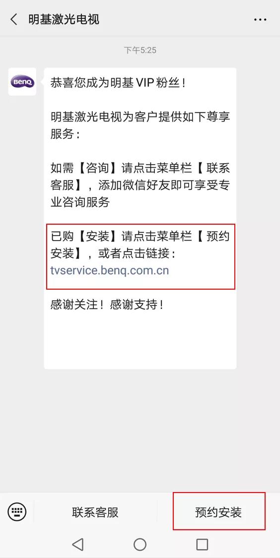 已購明基激光電視的客戶請注意!不用再打電話溝通半天,關注明基激光電視官方公眾號,微信預約廠家上門安裝非常簡單,按以下四步操作即可: