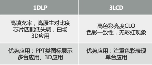 主流工程機主要以單片DLP(1DLP)與3片LCD(3LCD)技術為絕對主流,在較高亮度段已經出現的3DLP和LCOS技術產品,1DLP和3LCD在主流工程市場仍然保持二分天下的競爭勢態,我們可以根據客戶演示內容的類型來進行更科學的配置?陀^來說,兩種顯示技術各有優劣,DLP的技術優勢集中體現在較高填充率、較高原生對比度、較低芯片匹配失調、較高刷新率(單機主動3D);而3LCD的技術優勢集中體現在高色彩亮度、色彩一致性(無彩虹現象)等等。