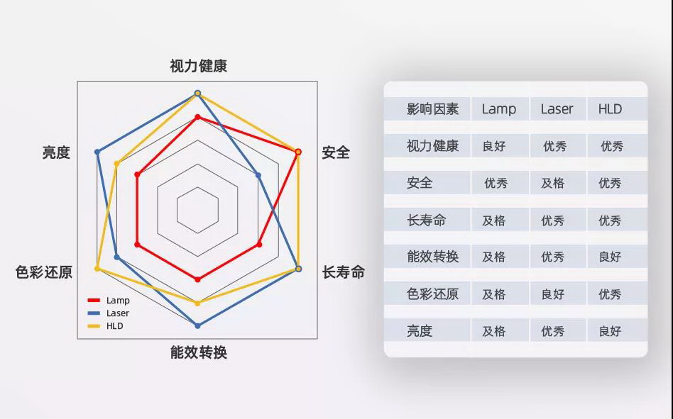 燈泡光源在主流工程機市場已是明日黃花,以單藍色激光二極管(Laser Diode)和HLD高亮LED為代表的固態光源技術大行其道。概括地講,固態光源的技術發展趨勢為光源模組集成度更高、能效轉換更好,高集成度可以讓投影機的體積進行更好的控制,我們會在市場上看到更多的小體積高流明新機種,而已經推向市場的產品平臺也可以通過更換集成度更高的光源模塊獲得亮度的大幅升級。能效比主要體現在投影機的功耗參數,我們會看到同樣亮度的機器功耗有顯著的降低。