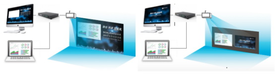 多畫面處理技術又可以分為單臺(投影機)多信號處理技術和多臺(投影機)信號處理技術,單臺多信號類似于矩陣的概念,可以實現單投影機多信號輸出,常見于畫中畫(PIP)和雙畫面并列(PBP),也有類似于多圖層畫面同時顯示的遮罩技術。