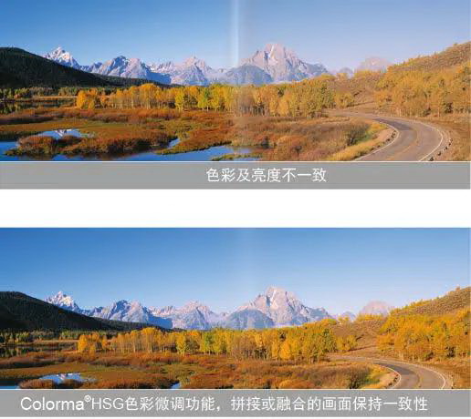 最常見的多臺信號處理技術是Edge Blending邊緣融合技術,這一技術也逐步成為主流工程投影機的標準配置,邊緣融合產品和技術本身已經是一個市場巨大的市場,從傳統的軟融、硬融發展到網絡分布式階段,不過據我們觀察,目前投影機自帶的融合技術發展還處在較為原始的階段。在很多項目中,投影機的融合功能并沒有得到真正應用,發展潛力還很大,融合技術要得到更好的應用,可以朝著簡單化或專業化方向發展,寶視來關注如何讓投影機的融合功能以更實用的人性化方式來呈現,技術的簡單化可以加快應用普及,我們也持續關注自動融合技術的發展。
