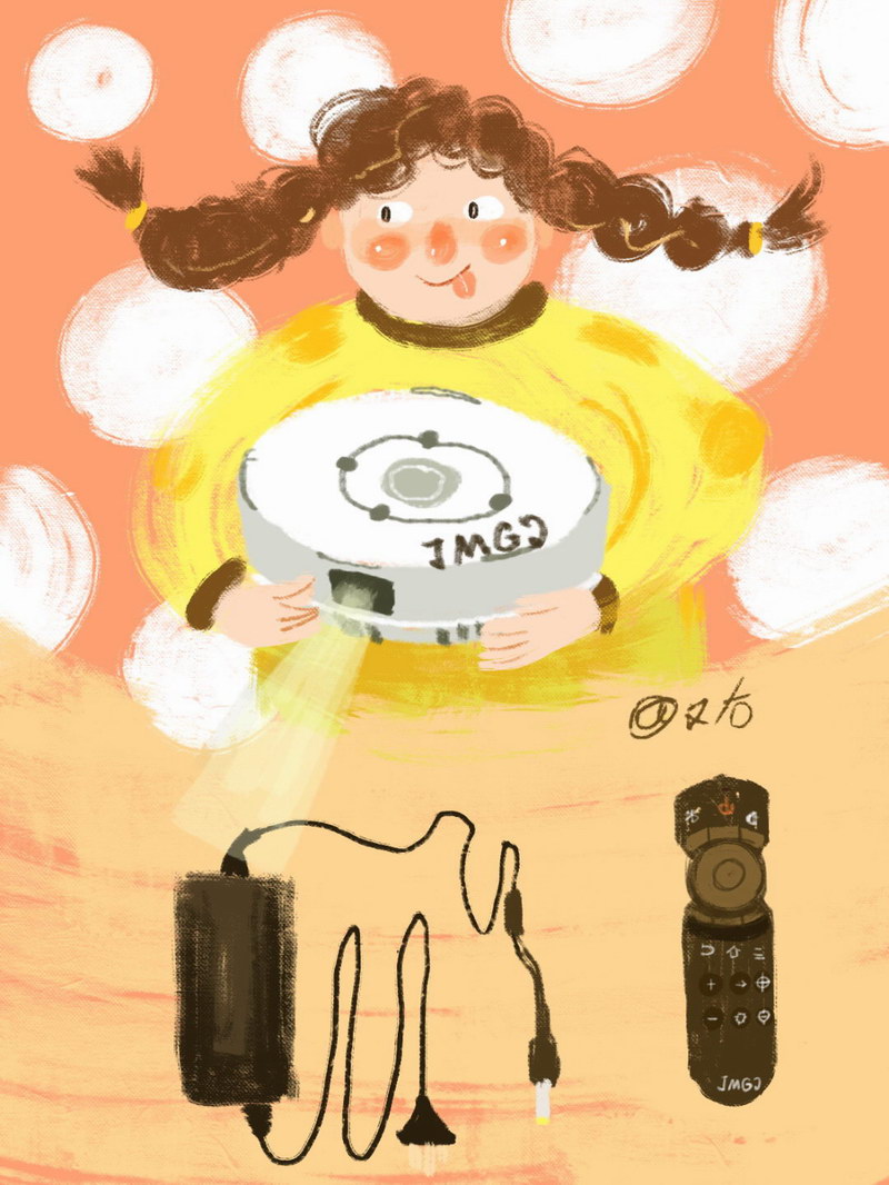 然而,隨著年齡的增長,一些思維定勢禁錮了我們的想象力,看待事物的角度也變得單一無趣。在普通人眼中,堅果G7S就是個平平無奇的圓形投影儀,但在插畫師充滿創意想法的奇妙世界里,它卻是個時時掛著笑臉的小孩,抑或是個百寶箱,裝滿了萬千世界,等待人們去開啟。