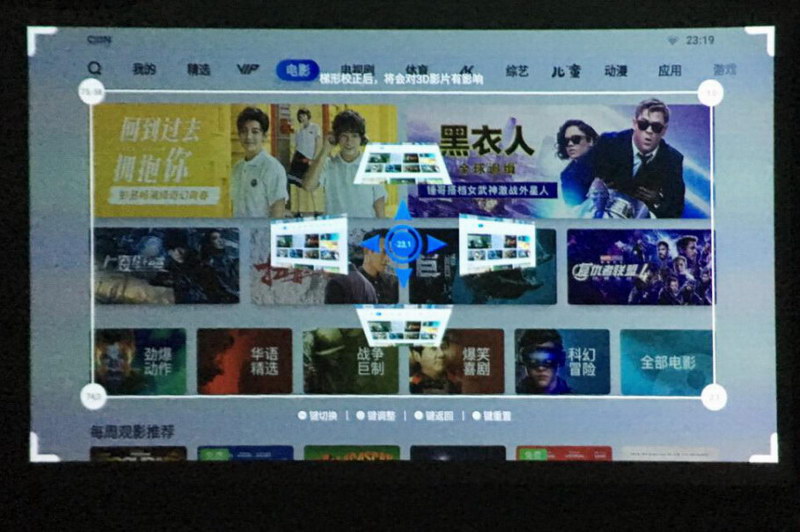 我一般會把堅果G7S放在臥室的床頭柜上,雖然是在側方位置,但呈現的畫面效果還是正的。這歸功于堅果G7S自帶的一鍵對焦和梯形校正功能,它可以在45度范圍內對畫面進行調整和補償,保證投影畫面方正不易變形,設置起來也非常合理方便。