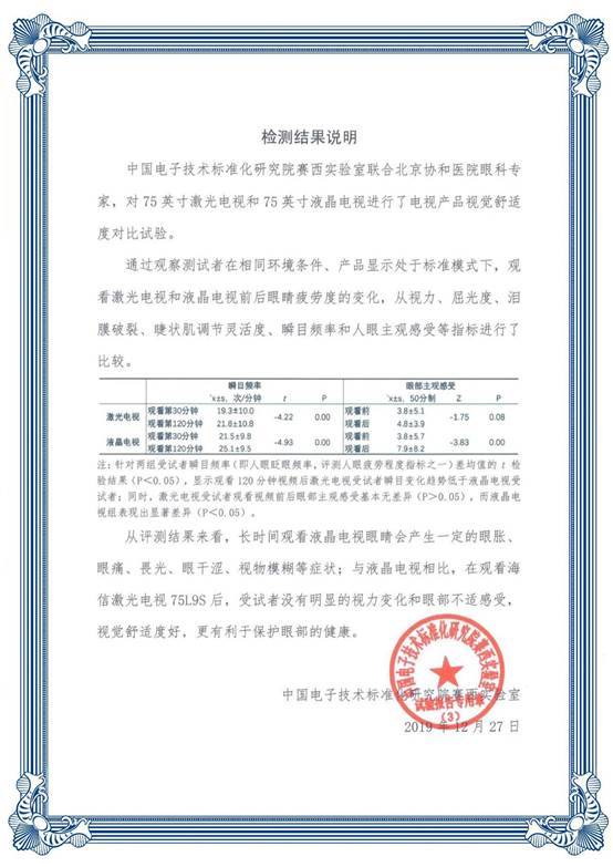 北京協和醫院眼科專家和中國電子技術標準化研究院賽西實驗室,兩大國家級權威機構選取海信激光電視作為檢測產品,共同從屈光度測試、淚膜破裂時代、調節靈活度測試、瞬目頻率統計等方面,對人眼疲勞度和舒適度的變化差異做出判定。