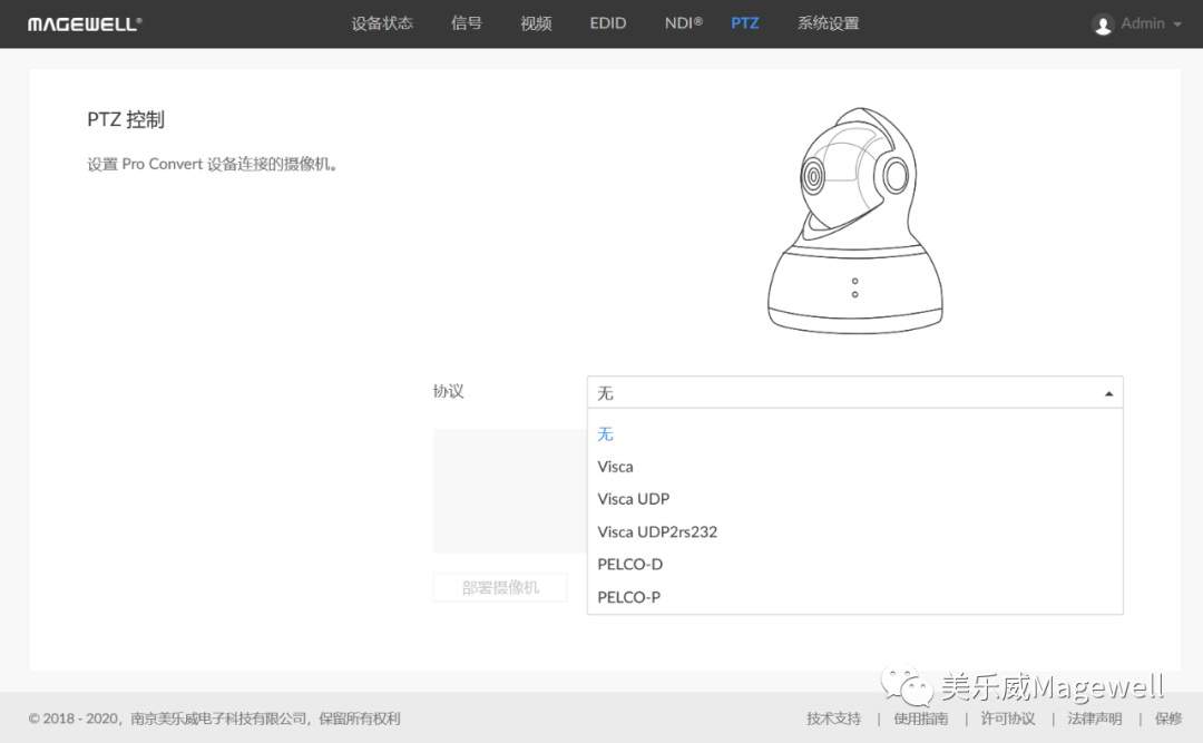 美樂威Pro Convert 系列NDI編碼器支持五種PTZ控制協議,分別為Visca,Visca UDP,Visca UDP2rs232,PELCO-D和PELCO-P,以滿足用戶在不同使用場景下控制PTZ相機。