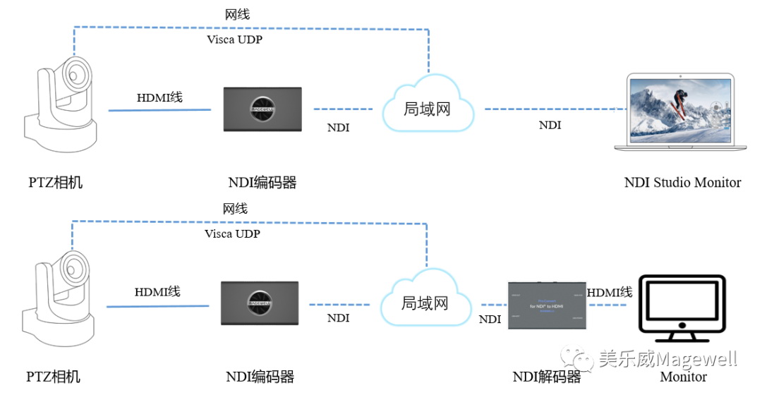 針對具有RJ45網口的PTZ相機,用戶可將攝像機連入美樂威NDI編碼器相同的局域網,并通過HDMI線連接該編碼器。由NDI解碼端(可以是支持NDI解碼且整合了NDI PTZ SDK的軟件,如NDI studio monitor或者是美樂威NDI解碼器)發送過來的PTZ指令會被美樂威NDI編碼器轉換后以Visca UDP協議發給PTZ相機,進而控制PTZ相機。具體設備連接方案如下圖: