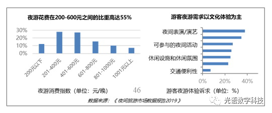 夜游參與度高、消費旺盛,正處于快速發展階段。據《夜間旅游市場數據報告2019》說明,夜游消費已成為旅游目的地夜間消費市場的重要組成部分:一方面,國內旅游平均停留時間為3天,人均夜游停留時間為2.03晚,游客夜游需求強烈,與游客在白天以游覽性消費為主不同的是,夜游需求更多元,且以夜間演藝、休閑活動等文化體驗為主,隨著夜游產品的豐富多元化,未來夜游需求將持續旺盛;另一方面,消費旺盛,不包括住宿、交通,人均夜游花費201-600元的占比54.9%,總體市場規模呈現放量趨勢,夜游消費的潛力巨大。