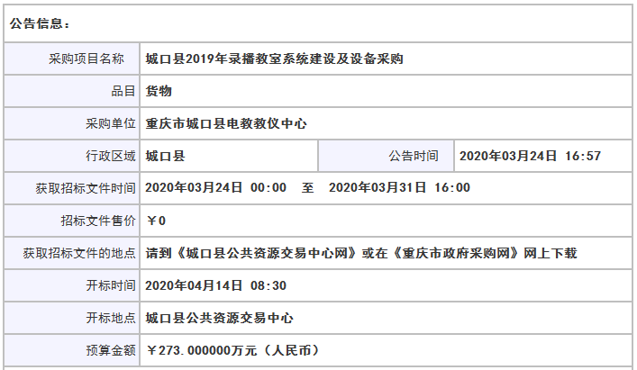 城口縣2019年錄播教室系統(tǒng)建設(shè)及設(shè)備采購(gòu)(19A1018)采購(gòu)公告