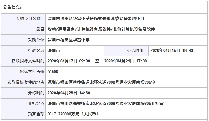 采購項目名稱: 深圳市福田區華富中學便攜式錄播系統設備采購項目