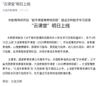 自疫情爆發以來,大連市教育局組織全市數百位教學名師精心制作,結合學生假期學習生活特點,推出了“大連教育數字課堂(2020寒假特別版)”,開設疫情防護知識、假期學習指導、名師課程講堂等欄目,并同步推送多種數字資源。