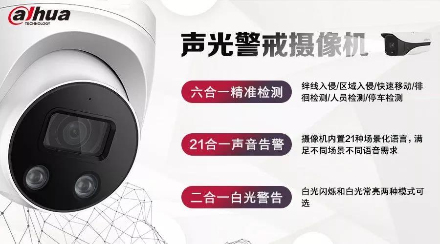 大華聲光警戒攝像機自發布以來,以其精準智能檢測、靈活布控智能方案、多場景警戒語音搭配、聲光實時警戒以及后臺報警等產品優勢,已廣泛應用于社區、園區、工地、商場、消防通道等場景。