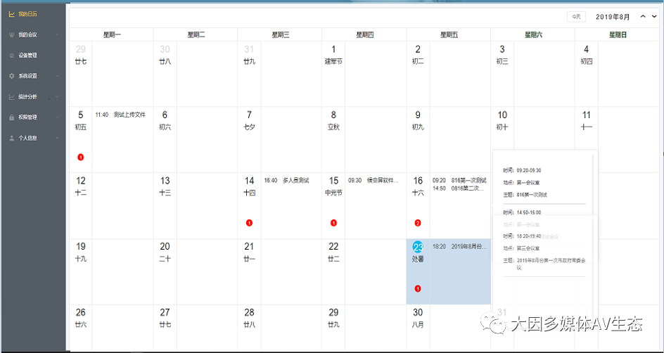 系統支持用戶全員使用,具有個人會議日歷導航、個人信息查看與編輯,以及按其系統角色權限授權可用的其他功能。