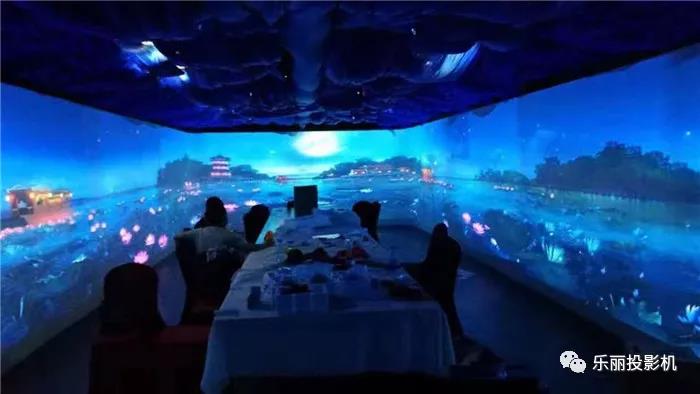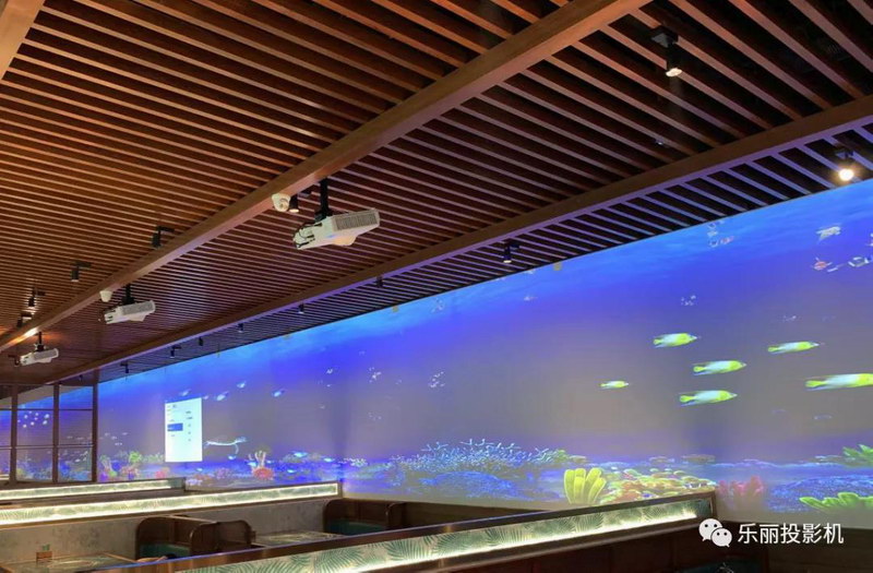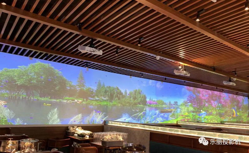 此項目地為深圳市四季椰林旗下寶安大仟里商場四樓四季椰林餐廳,餐廳以熱帶雨林為主題,環境優雅,極具熱帶雨林氣息,主營熱帶地區新派火鍋和東南亞美食,區別于傳統火鍋餐廳及東南亞餐廳,非常適合朋友聚會、情侶約會、家庭聚餐。四季椰林餐廳倡導歡樂健康的飲食和生活理念,從菜品、服務到就餐環境,處處體現四季椰林餐廳"歡樂椰林、健康四季"精神理念.此項目應用了ROLY 8臺 RL-S43W激光短焦投影機,利用拼接融合技術搭建了寬25米,高3米的影劇院巨幕,將各種場景利用投影機投射到超大巨幕,營造沉浸式現場,將科技和美食相融合,用餐的同時既能享受美食也能感受到奇幻的沉浸之感.