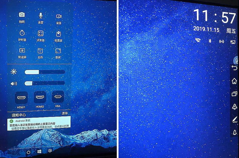 東方中原單獨設(shè)計的功能欄,將拍照、錄音、錄屏、計時器、計算器、投票器、歡迎屏、日歷、截屏功能單獨列出,還可以調(diào)節(jié)亮度、音量和選擇信號源(左)。
