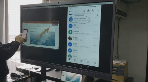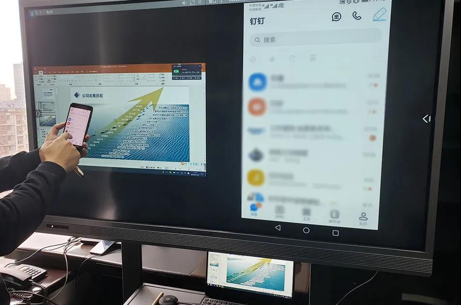 可以選購第三方合作的投屏器,接到筆記本上按一下投屏器按鈕就可以實現(xiàn)同步投屏,演講PPT之類的情況,演講者可以在智能會議平板上對筆記本進行反向操作、修改文檔,無需回到筆記本前操作