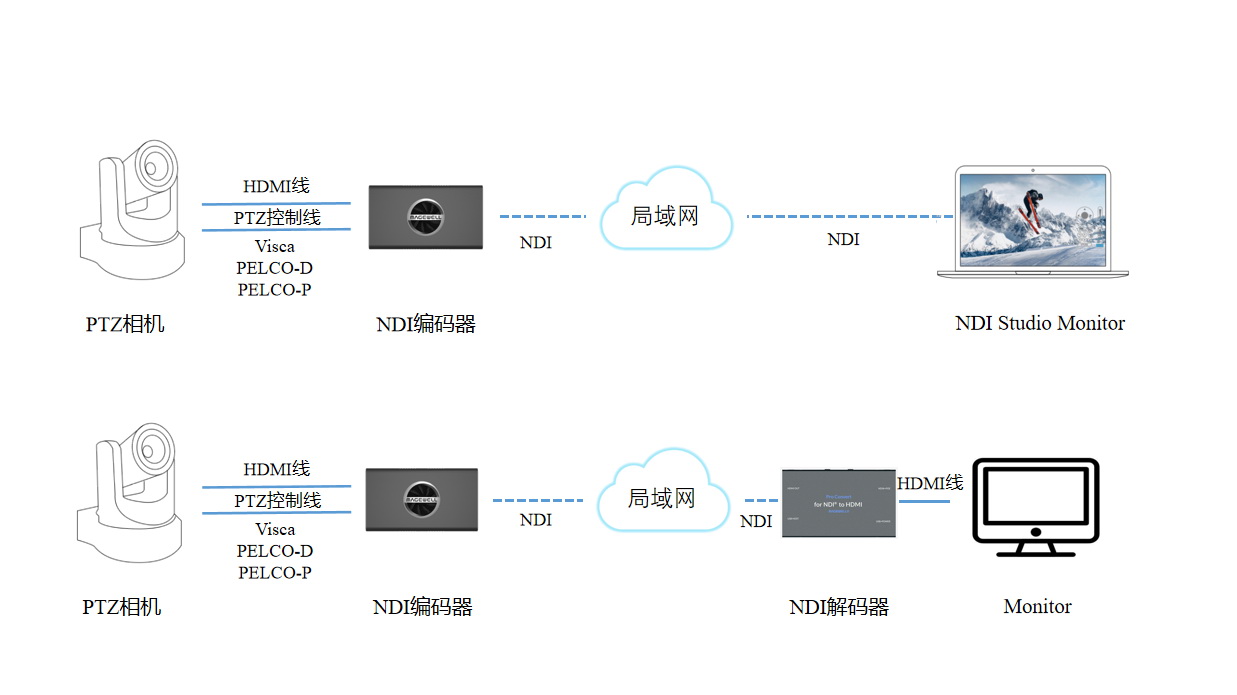 針對具有RJ45網口的PTZ相機,用戶可將攝像機連入美樂威NDI編碼器相同的局域網,并通過HDMI線連接該編碼器。由NDI解碼端(可以是支持NDI解碼且整合了NDI PTZ SDK的軟件,如NDI studio monitor或者是美樂威NDI解碼器)發送過來的PTZ指令會被美樂威NDI編碼器轉換后以Visca UDP協議發給PTZ相機,進而控制PTZ相機。具體設備連接方案如下圖: