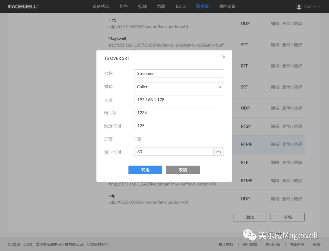 7. 設置完成后點擊確定,頁面會增加一個SRT Caller流的條目。