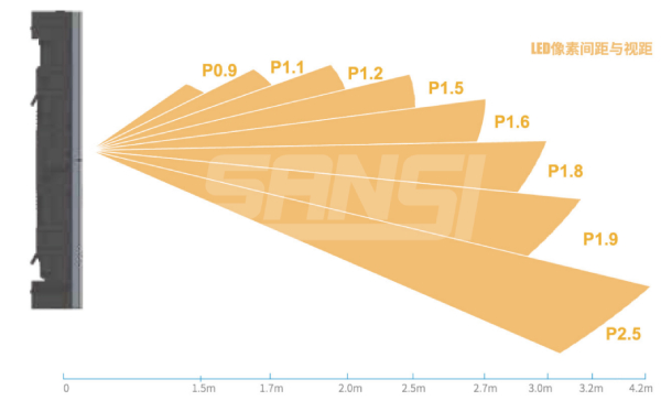為在有限的會議空間保證良好的觀看效果又不過分傷及人眼, 這些會議室小間距系統(tǒng)的點間距都會有一個合理的數(shù)值(一般不會超過4mm)。以人視線高度1米為例,第一排用戶所處位置與屏體的距離作為參考, 我們給出一份不同點間距下,會議室小間距屏的建議觀看距離(下圖)(點間距≤3mm)。