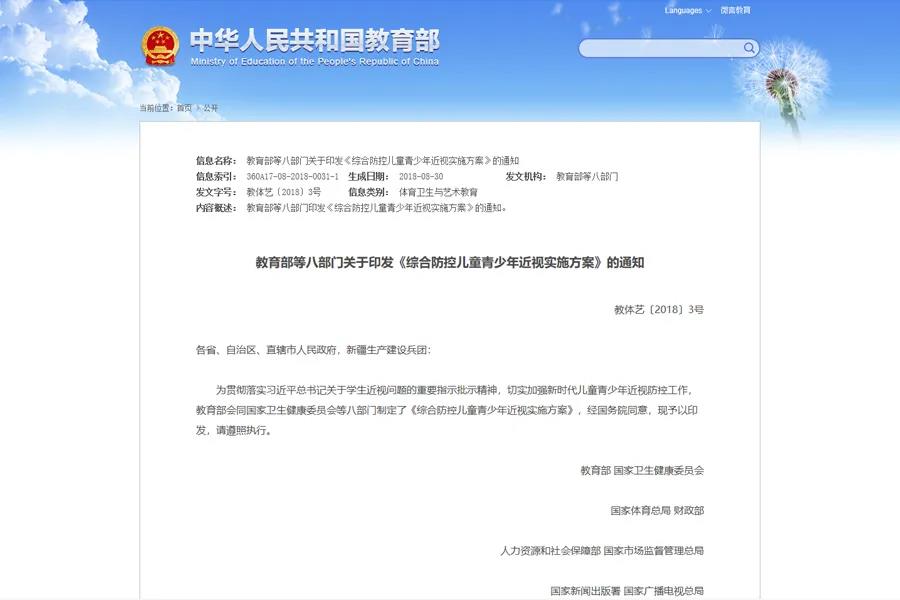 早在2018年8月30日,教育部、國家衛(wèi)生健康委員會(huì)等8部門已經(jīng)聯(lián)合印發(fā)《綜合防控兒童青少年近視實(shí)施方案》,提出了到2030年中國6歲兒童近視率控制在3%左右的目標(biāo)。