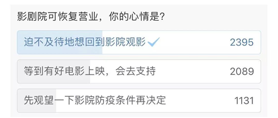 在微博“新浪電影”關于影院復工的投票中,投票排名首位的是“迫不及待地想回到影院觀影”。足以證明壓抑了三個多月的觀影需求,急需得到釋放。電影作為更具藝術性的文化表達載體,讓大家在影院放松觀影的同時,通過電影感知生活、探索世界。這也充分證明了電影院的價值所在,絕非網絡所能取代。