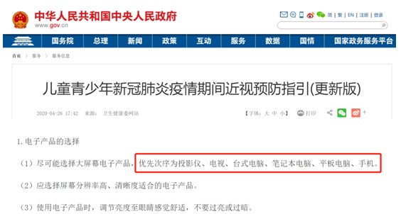 日前,國家衛(wèi)生健康委發(fā)布了《兒童青少年新冠肺炎疫情期間近視預(yù)防指引》,對(duì)電子產(chǎn)品的選擇優(yōu)先次序做出了規(guī)范,《指引》指出:“盡可能選擇大屏幕電子產(chǎn)品,優(yōu)先次序?yàn)橥队皟x、電視、臺(tái)式電腦、筆記本電腦、平板電腦、手機(jī)。”