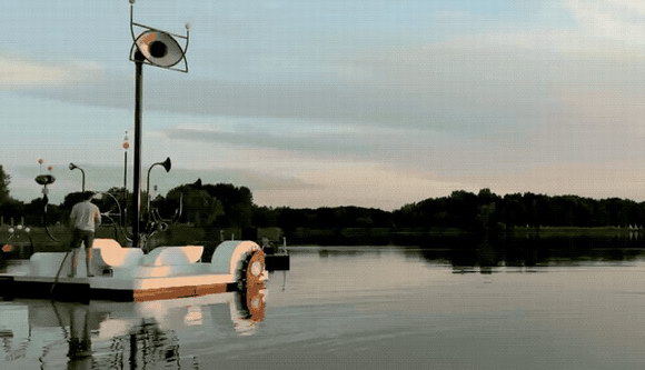人們越是向湖岸邊潛望鏡似的裝置里大喊,湖面上的迷幻動畫就越是明艷多彩;人們跳舞和喊叫的次數越多,他們越能直接影響節日上的動畫和視頻。仔細看,你會發現驚喜不僅是毫無意義的圖案、形狀孤立的展示,更重要的是,它還可以通過水幕的形式,給你娓娓道來一個生動的故事,讓人更加無法錯過,戲劇性也凸顯得十分明顯。除了動作還有聲音,對著裝置上的“喇叭”吶喊,水幕也會隨著聲音而改變,給予了觀眾全方位的感官體驗,“體驗與分享”是這個show的精神所在。