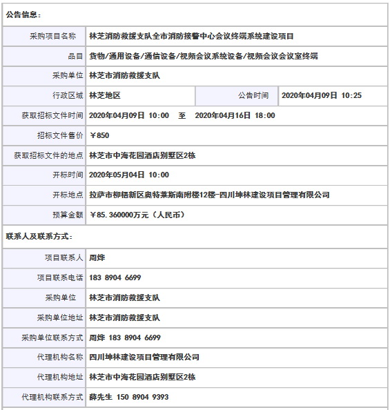 采購項目名稱: 林芝消防救援支隊全市消防接警中心會議終端系統建設項目