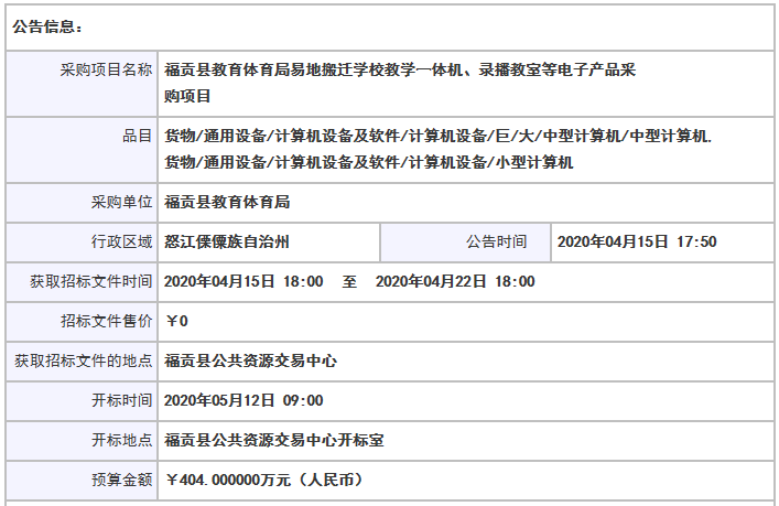 福貢縣教育體育局易地搬遷學校教學一體機、錄播教室等電子產品采購項目招標公告