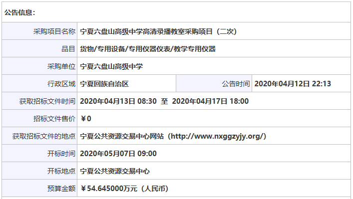寧夏六盤山高級中學(xué)高清錄播教室采購項目(二次)項目招標(biāo)公告