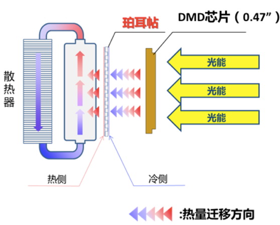 此外,針對DMD芯片的散熱問題,CN5550QL特別采用了全新的珀耳帖散熱技術(shù),通過溫差電效應(yīng)更快吸收DMD芯片熱量,一對一輔助芯片加速散熱,散熱效率更高。