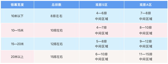 最佳觀影位置需綜合考慮視覺和聽覺兩方面因素,在此區(qū)域內(nèi)觀影,既能讓觀眾獲得絕佳的視覺臨場感,也能避免回聲、聲聚焦等聲學(xué)缺陷,擁有更具層次、更立體的聽覺體驗(yàn)。最佳觀影區(qū)域的位置通常根據(jù)影廳大小而有所差異,具體可參考下表: