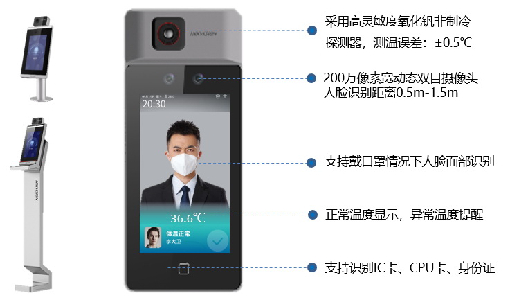 具備人體測溫功能的人臉識別組件,可以用于人員通道、門禁等;可完成人臉識別、體溫測量及不戴口罩提醒,保護作業人員身體健康。