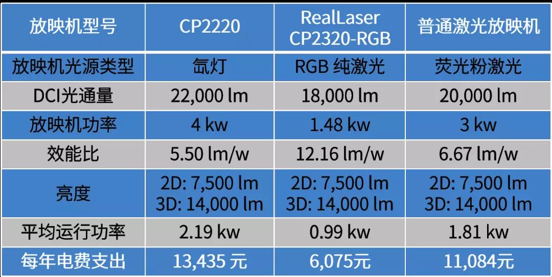 計算參數(shù)備注:2.4增益銀幕;3D光效26%;2D目標(biāo)亮度 14 fL,3D目標(biāo)亮度 7 fL;每天 3D 影片排片率 70%;每天放映時長12小時;電費(fèi) 1.4元/小時。