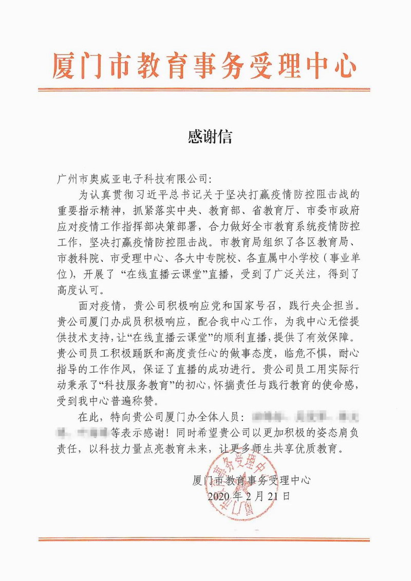 圖為奧威亞獲廈門市教育事務受理中心感謝信