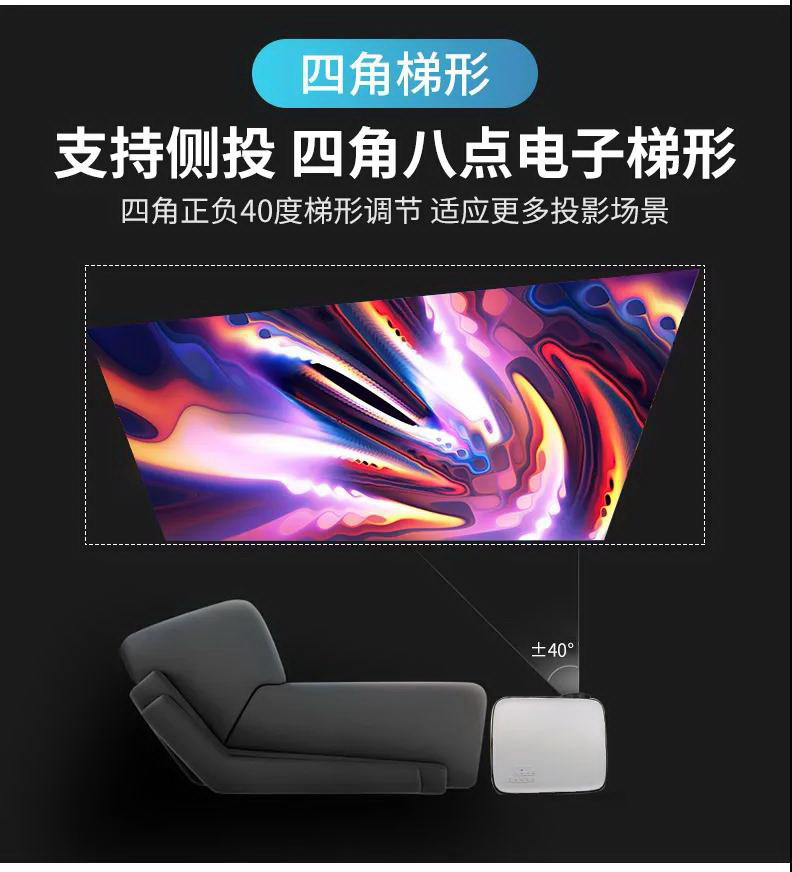 焦距范圍靈活,±40度電子梯形校正功能,更可以從側(cè)面實(shí)現(xiàn)多角度投影,安裝擺放更輕松,畫面尺寸隨心所欲。無論客廳、臥室甚至?xí)康泉M小空間,茶幾、床頭柜或書柜上,選擇您喜歡的位置,隨時(shí)隨地享受大畫面的樂趣!