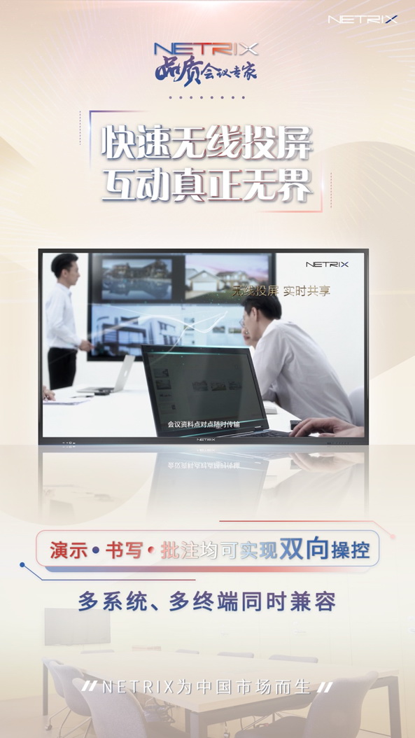 以NETRIX智能交互平板為首的數字化辦公設備,集產品穩定性、互動性、易用性和流暢性等多方面優勢于一身,通過提高會議效率,改善會議環境,降低運營成本助力政企實現數字化、智能化的全面升級,領跑數字化轉型熱潮。NETRIX專為中國市場設計、研發、制造,擁有獨特的4K超高清顯示、流暢的智能書寫及快速的無線投屏等功能設計。