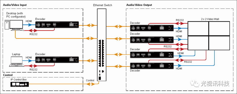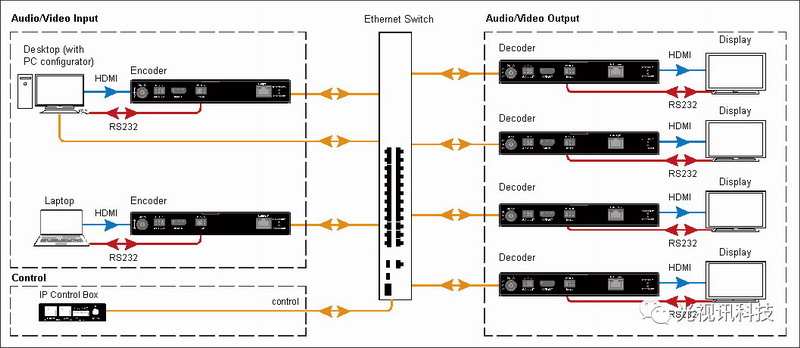 將IPM-1000T與H.265解碼器IPM-1000R相連可以搭建IP矩陣網絡。你還可以利用PC Console工具對此功能進行配置和管理。