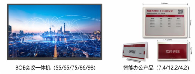 本次發布會BOE還推出了智能會議解決方案,會議涉及各行各業,開會的效率直接決定了企業的運作效率,尤其伴隨疫情而來的遠程協作市場的爆發,進一步讓企業更加看重開會的效率,本次BOE推出了55、65、75、86、98寸會議一體機,以滿足不同大小會議室需求,同時推出了智能辦公管理系統,其中包含墨水屏7.4寸會議桌牌、12.2寸會議門牌、4.2寸辦公桌牌等產品,墨水屏極低的功耗、無需布線等優勢大幅推動了無紙化辦公進程。