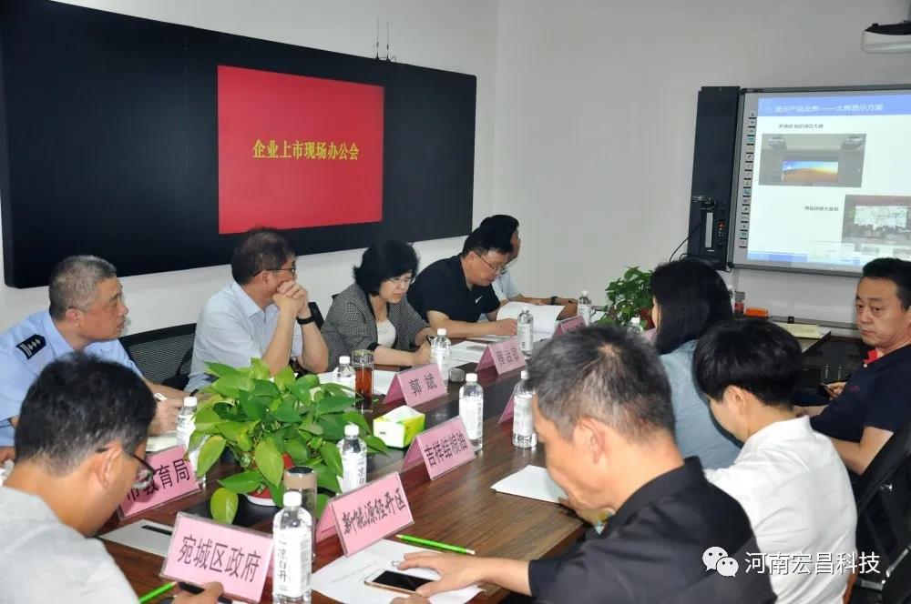 7月15日上午,南陽市人大常委會副主任郭斌和南陽市金融工作局程治敏局長、帶領南陽市金融工作局、市財政局、市公安局、市教育局、宛城區政府、高新區管委會、宛城區農信社等單位領導到河南宏昌科技有限公司調研,召開企業上市現場辦公會,加快推進企業上市步伐。
