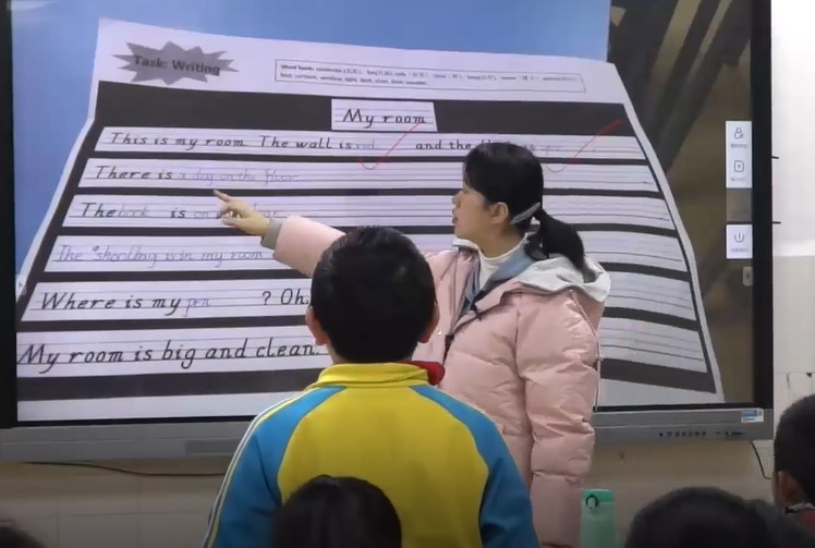課堂的最后一個(gè)環(huán)節(jié),張老師決定讓學(xué)生進(jìn)行自主寫(xiě)作,嘗試描述自己的房間,鍛煉實(shí)際應(yīng)用能力。張老師利用希沃易課堂的拍照上傳功能,讓學(xué)生將作答結(jié)果上傳到大屏上,并隨機(jī)挑選了一份學(xué)生作業(yè),一邊批注,一邊讓學(xué)生跟讀,不斷強(qiáng)化學(xué)生的口語(yǔ)表達(dá)。
