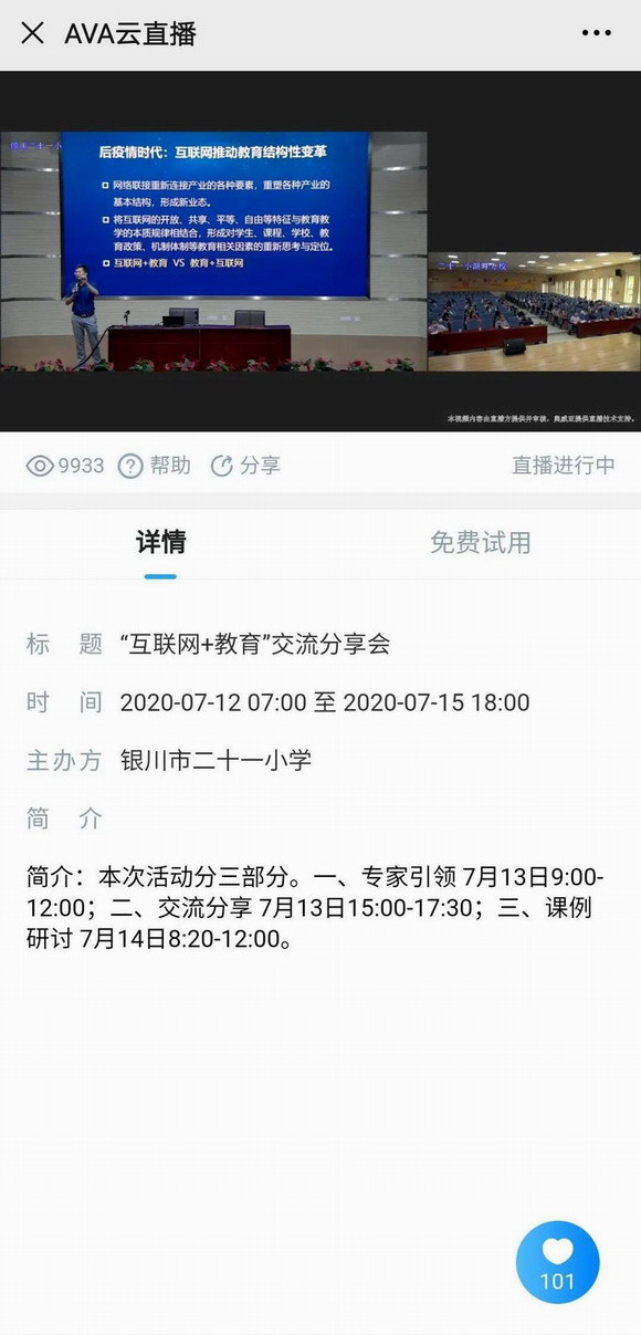 7月13日至14日,寧夏銀川市二十一小教育集團舉辦了為期2天的“互聯網+教育創新”——線上線下教學融合新模式交流分享活動。在奧威亞云直播支持下,活動采用線上線下同步直播、場內場外同時互動的方式,匯聚教育同仁,共同探索新形勢下的“互聯網+教育”高質量、新發展之路,吸引了寧夏自治區內遠至固原、西吉等邊遠山區學校線上觀看,總觀看人次達11.31萬。