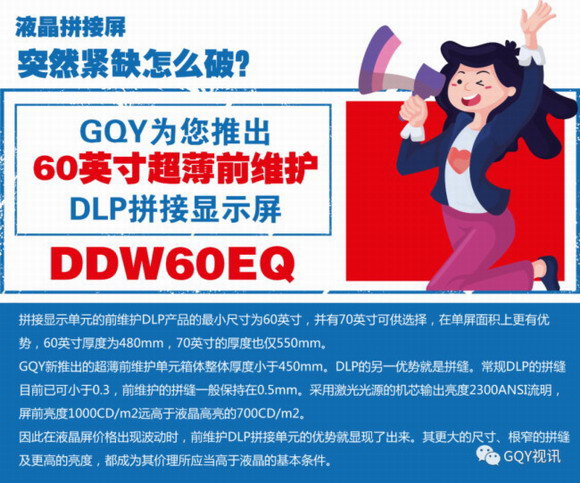為解市場燃眉之急,GQY通過線上淘寶官方旗艦店及線下各分公司及辦事處限時推出應(yīng)急特價60英寸前維護DLP單元并有整套的2x2系統(tǒng)、2x3系統(tǒng)及2x4系統(tǒng)供大家選擇。